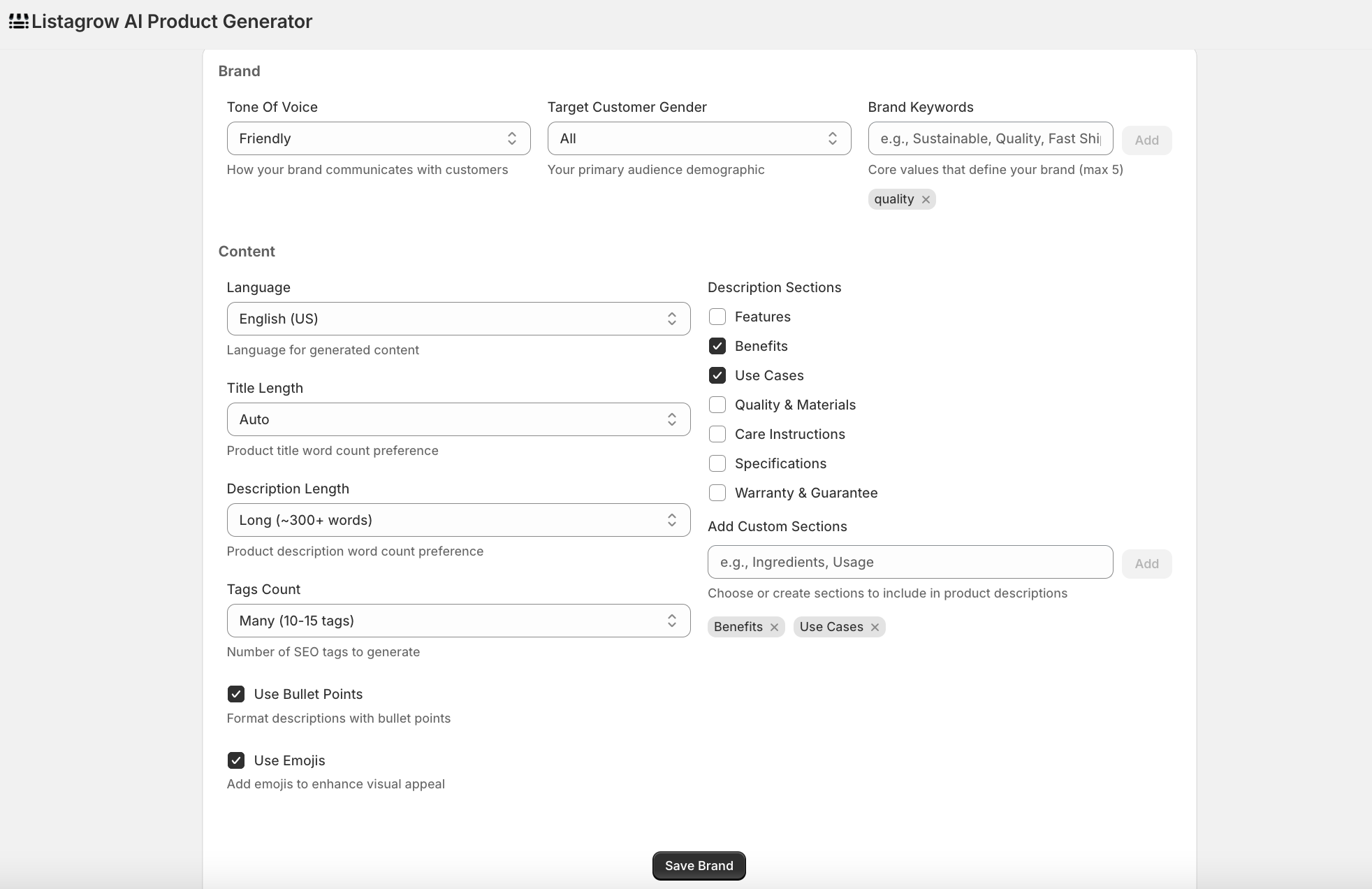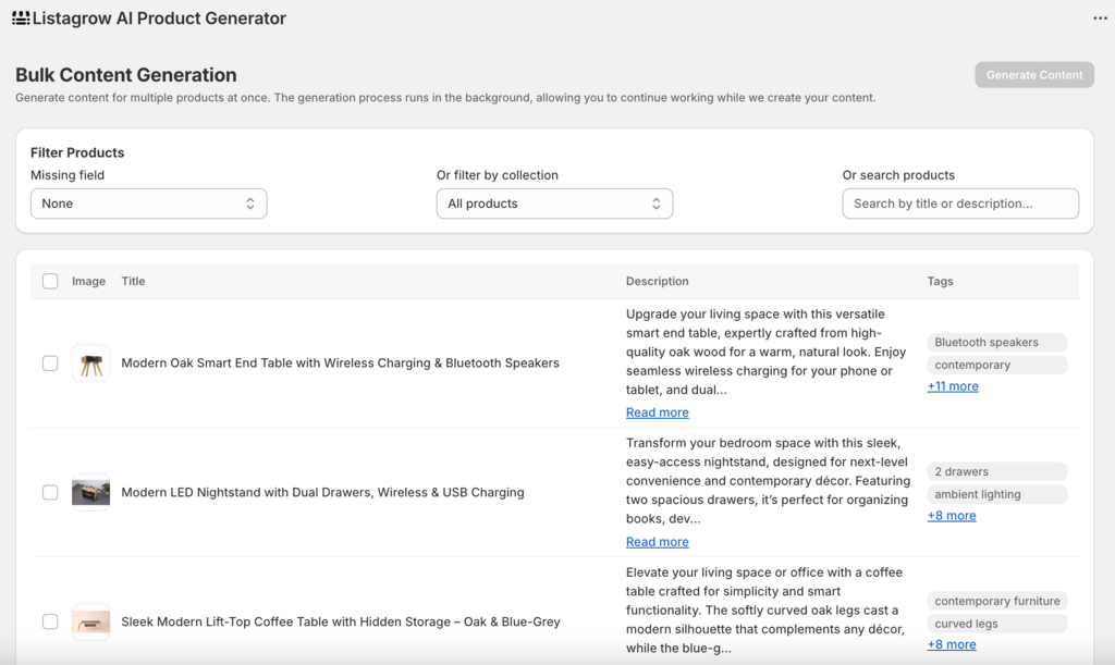يُنشئ على الفور محتوى عالي التحويل ومتوافق مع العلامة التجارية من صورة المنتج باللغة التي تختارها، بما في ذلك العناوين، الأوصاف، نصوص البديل، بيانات تحسين محركات البحث، والعلامات، كل ذلك دون مغادرة شوبفاي.