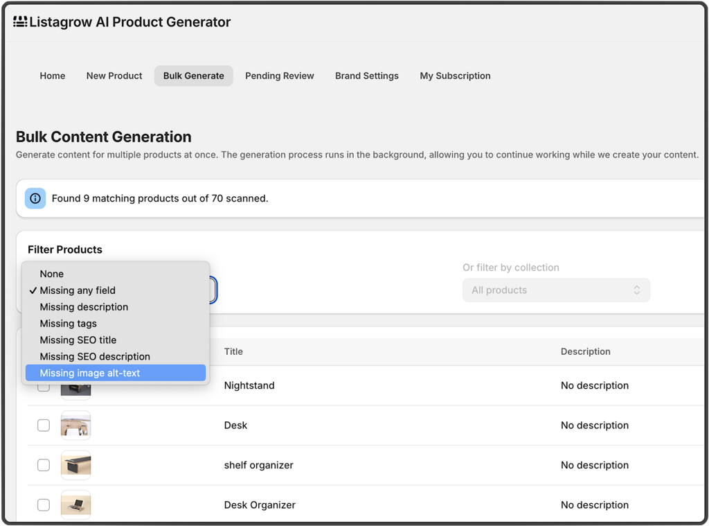 Listagrow automatically identifies products with missing information and lets you generate the missing content in bulk. Whether you're launching a new collection or updating your entire catalog, you can scale your catalog effortlessly.
