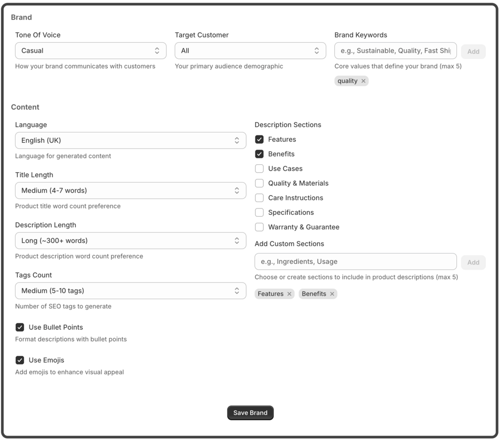 Define your brand's voice, target audience, and content structure once. Listagrow uses this "blueprint" to automatically generate every product title, description, and tag with unwavering consistency, ensuring your entire catalog is unmistakably on-brand.