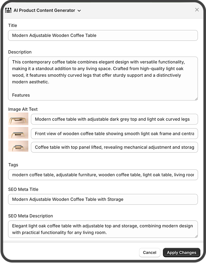 Instantly generate high-converting, on-brand content from product photos as part of a smooth product onboarding process including titles, descriptions, alt text, SEO metadata, and tags in your language of choice and according to your content guidelines. All without leaving Shopify. Easily generate product descriptions with precision, using a built-in product title generator and tools that deliver truly AI generated product descriptions tailored to your brand.