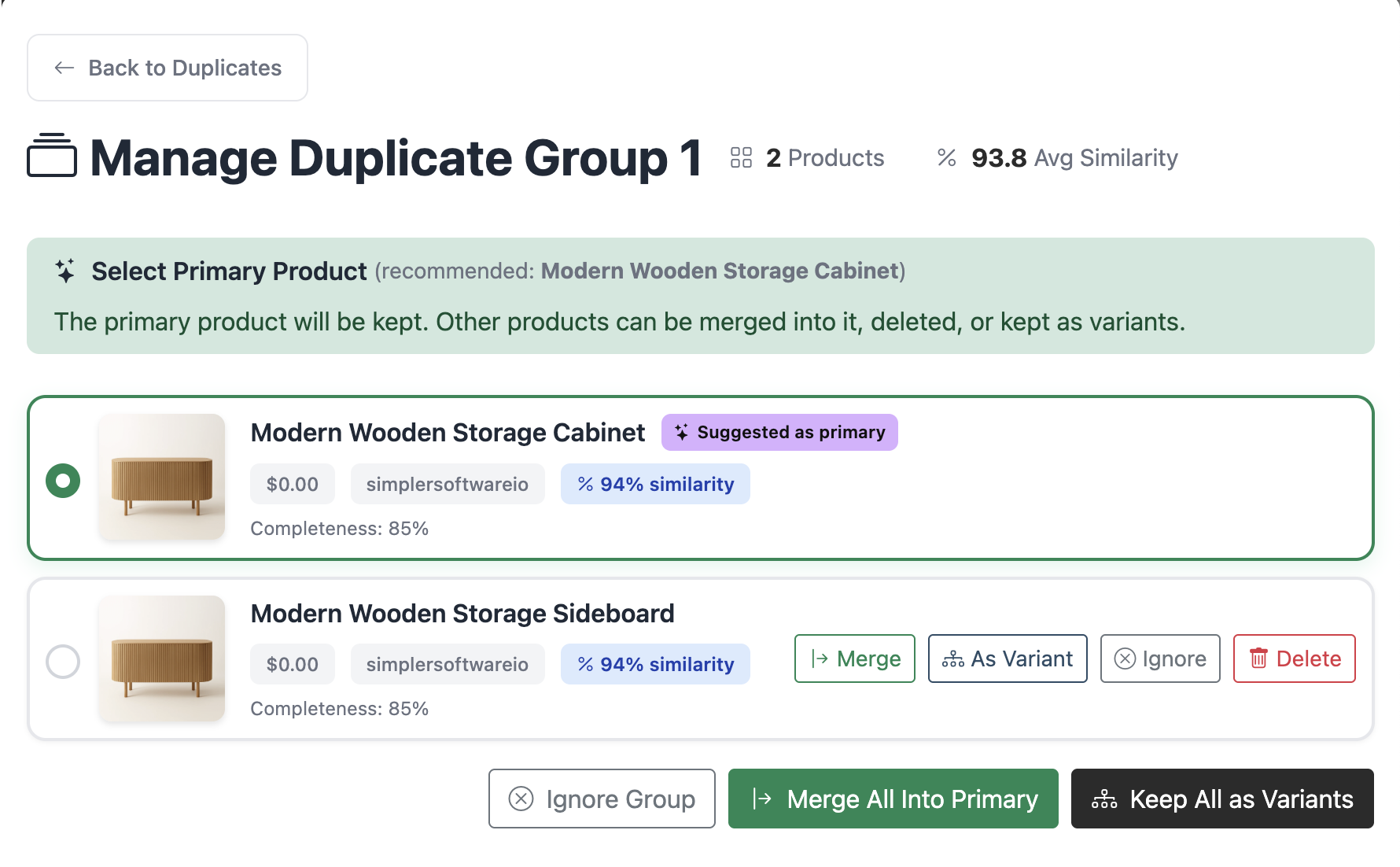 Identify and merge duplicate products across suppliers automatically. Keep your catalog clean and prevent customer confusion with intelligent matching and resolutions.